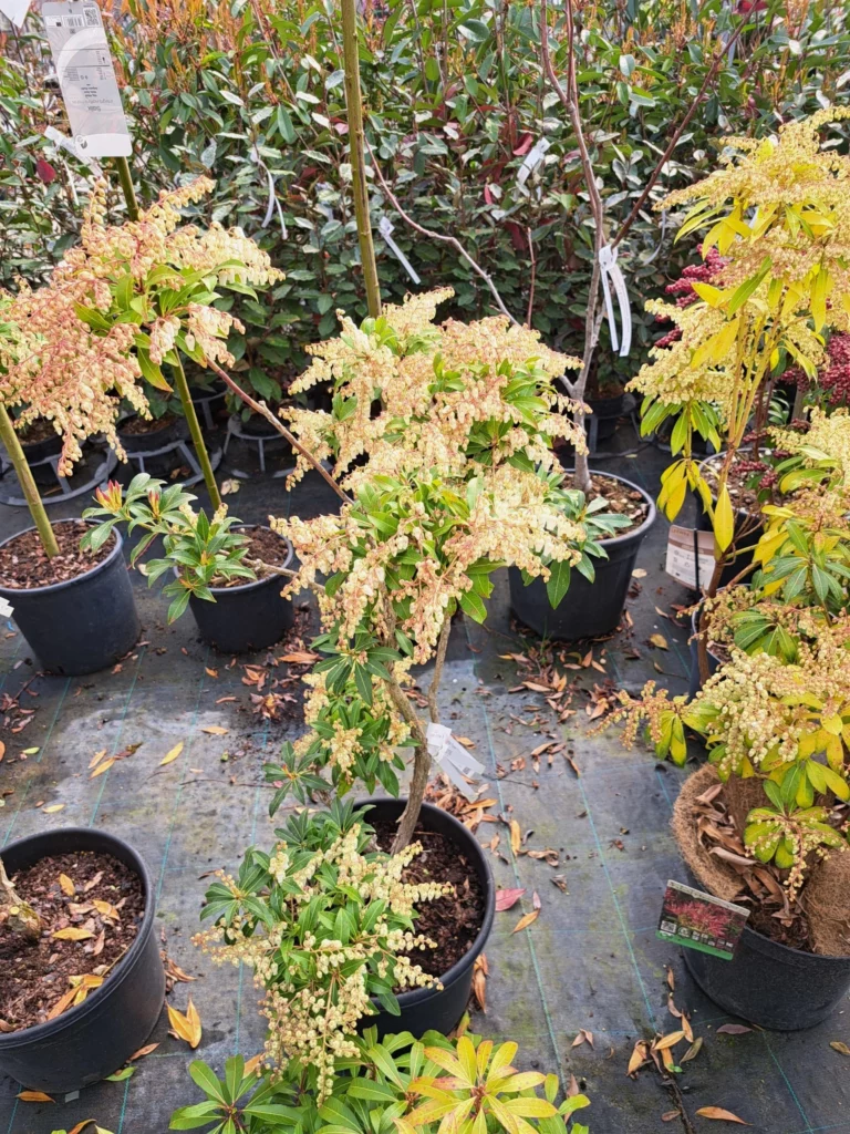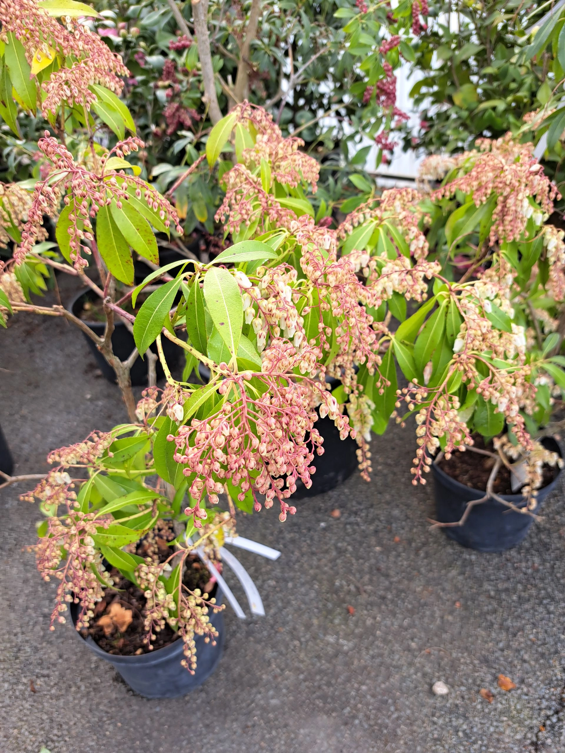 Le feuillage du Pieris japonica ‘Forest Flame’ est vert intense fin et pointu.