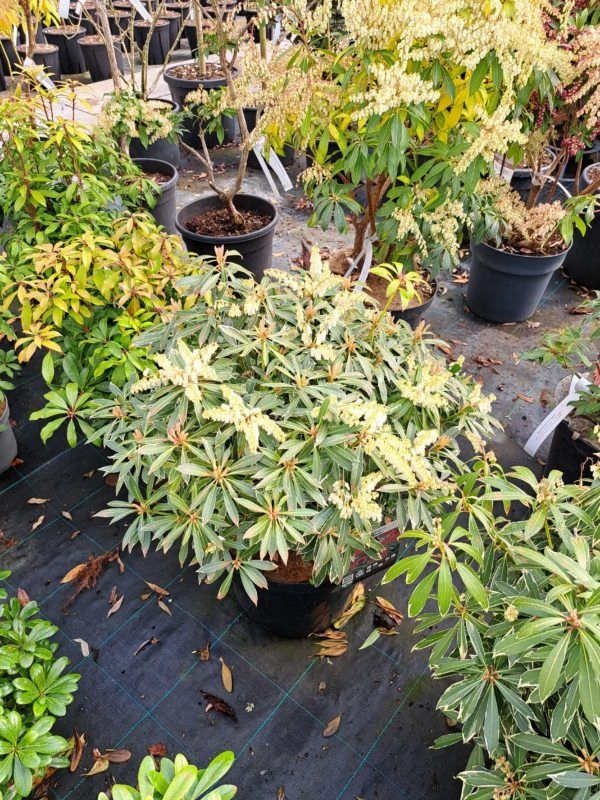 Le feuillage du Pieris japonica ‘Flaming Silver’ est panaché vert intense-marginé de blanc.