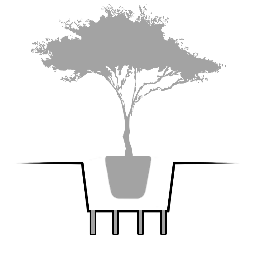 Réalisez un trou d’un diamètre équivalent à 2 fois la taille du conteneur et environ 30 cm plus profond que le pot et décompactez le fond du trou. Si votre terre est lourde, argileuse, réalisez un trou légèrement plus large, ainsi que des trous de carottage, et versez-y du minéral drainant (pouzzolane, gravier…).